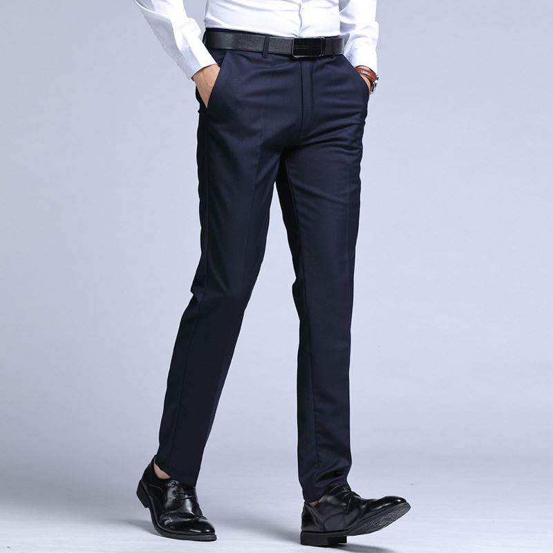 Herrbyxor med smal midja, veck fram och smal benform för kontor eller formella tillfällen.